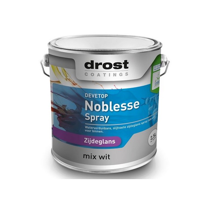Devetop Noblesse Spray, een watergedragen slijtvaste en huidvetbestendige spray lakverf, is zo ontwikkeld dat alle eigenschappen van onze Noblesse aflak ook in deze spray versie verwerkt zijn.